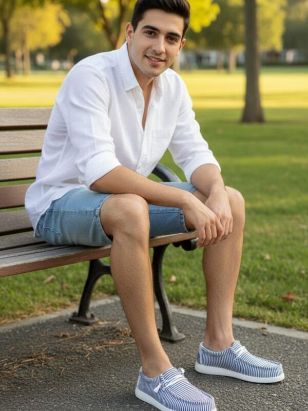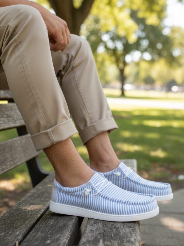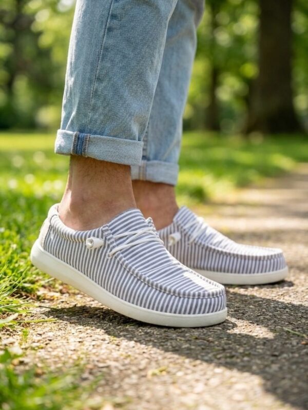 Choix des options Ce produit a plusieurs variations. Les options peuvent être choisies sur la page du produit Quick View34,95 €Les mocassins en toile marinière à rayures bleu ciel UOMO combinent un tissu léger avec une semelle en PU souple. La toile respirante laisse l’air circuler librement autour du pied. Cela apporte une vraie sensation de fraîcheur lors des journées chaudes de l’été. L’intérieur textile évite les points de friction, même lors de longues journées de travail. Ces mocassins casual reproduisent les slip-on modernes. Ils affichent une coupe basse épurée. Les rayures bleu ciel donnent au modèle son originalité. Cette teinte s’associe facilement à un short, un jean clair ou un pantalon de toile. Ces chaussures d’été homme sont parfaites pour les vacances, les balades en ville ou les sorties décontractées en bord de mer.