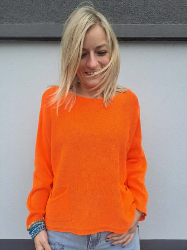 49,50 €Le prix initial était : 55,00 €.55,00 €Le prix actuel est : 55,00 €.Réalisé dans une maille fine au tombé impeccable, ce pull à col bateau et poches plaquées allie la qualité à un éclat chromatique. Sa coupe oversize et ses emmanchures tombantes procurent une sensation de bien-être, vous enveloppant de douceur tout au long de la journée. Ce modèle se distingue par son coloris orange vitaminé et ses deux petites poches avant qui dynamisent votre tenue. Parfait pour un assemblage avec un jean délavé ou pour accompagner un pantalon blanc, il s’impose comme la pièce maîtresse de vos tenues décontractées. Craquez pour ce concentré d’énergie et de style.