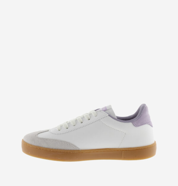 Les baskets Victoria BERLÍN CICLISTA Lila associent un effet cuir blanc immaculé à des pièces en cuir velours couleur lilas pour une combinaison douce et raffinée. Le V latéral Victoria, la doublure et la pièce arrière déclinent cette teinte lilas, apportent personnalité et élégance. Leur semelle translucide couleur caramel crée un jeu chromatique chaleureux qui sublime l’ensemble du design. Fabriquées en Espagne avec une semelle intérieure recyclée, ces sneakers allient style coloré et engagement responsable.