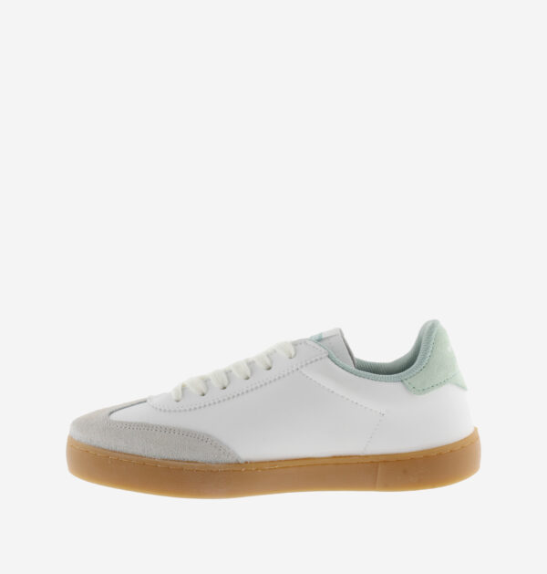 Ces baskets Victoria Berlin Ciclista affichent un design frais et épuré avec leur tige en cuir synthétique blanc rehaussée d’élégants empiècements en daim. Le coloris menthe, présent sur le logo « V » emblématique et le renfort au talon, apporte une note pastel délicate qui sublime la silhouette rétro de la chaussure. La semelle extérieure en gomme translucide couleur caramel offre un contraste chaleureux tout en garantissant une adhérence souple pour vos déplacements urbains. Fabriqué avec soin en Espagne, ce modèle combine des finitions soignées et des surpiqûres ton sur ton pour un look féminin résolument moderne.