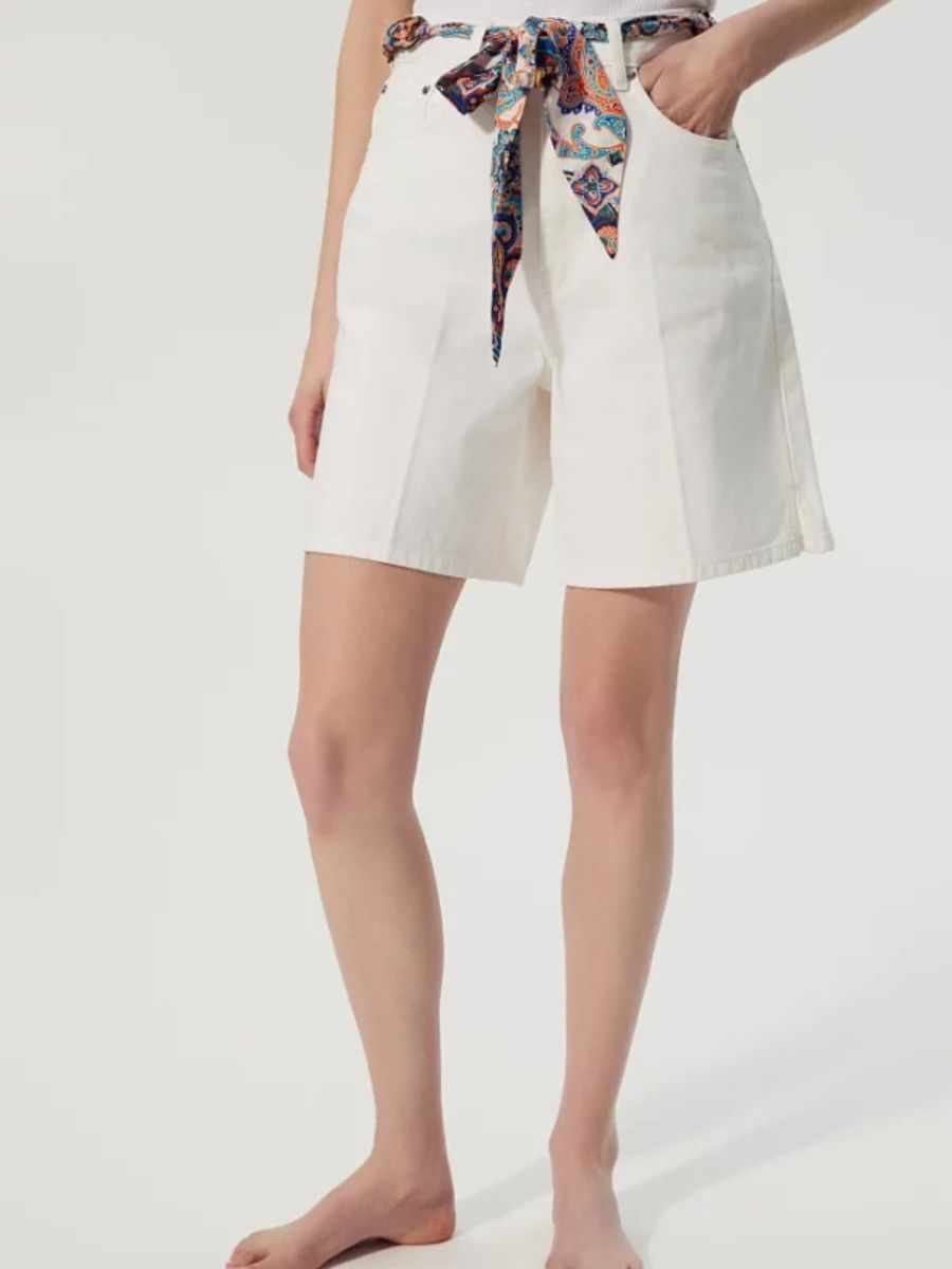 Ce short jean blanc se compose de 100 % de coton. Cette matière naturelle assure une bonne respirabilité durant l’été. La fibre offre aussi une grande durabilité au quotidien. Ce short jean femme dispose d’une fermeture et d’un zip éclair. Une ceinture foulard amovible accompagne ce bermuda denim blanc. La coupe décontractée permet une grande liberté de mouvement.