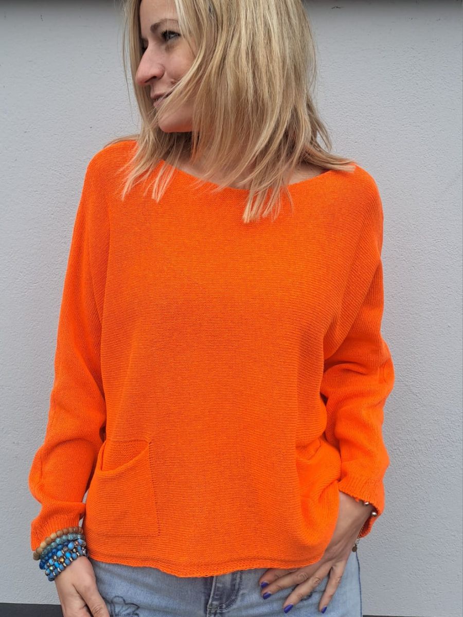 Réalisé dans une maille fine au tombé impeccable, ce pull à col bateau et poches plaquées allie la qualité à un éclat chromatique. Sa coupe oversize et ses emmanchures tombantes procurent une sensation de bien-être, vous enveloppant de douceur tout au long de la journée. Ce modèle se distingue par son coloris orange vitaminé et ses deux petites poches avant qui dynamisent votre tenue. Parfait pour un assemblage avec un jean délavé ou pour accompagner un pantalon blanc, il s’impose comme la pièce maîtresse de vos tenues décontractées. Craquez pour ce concentré d’énergie et de style.