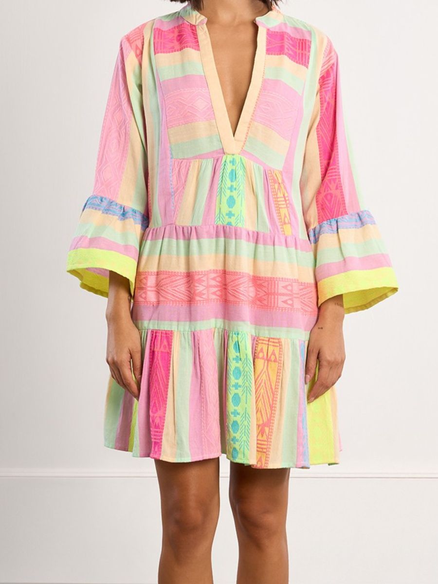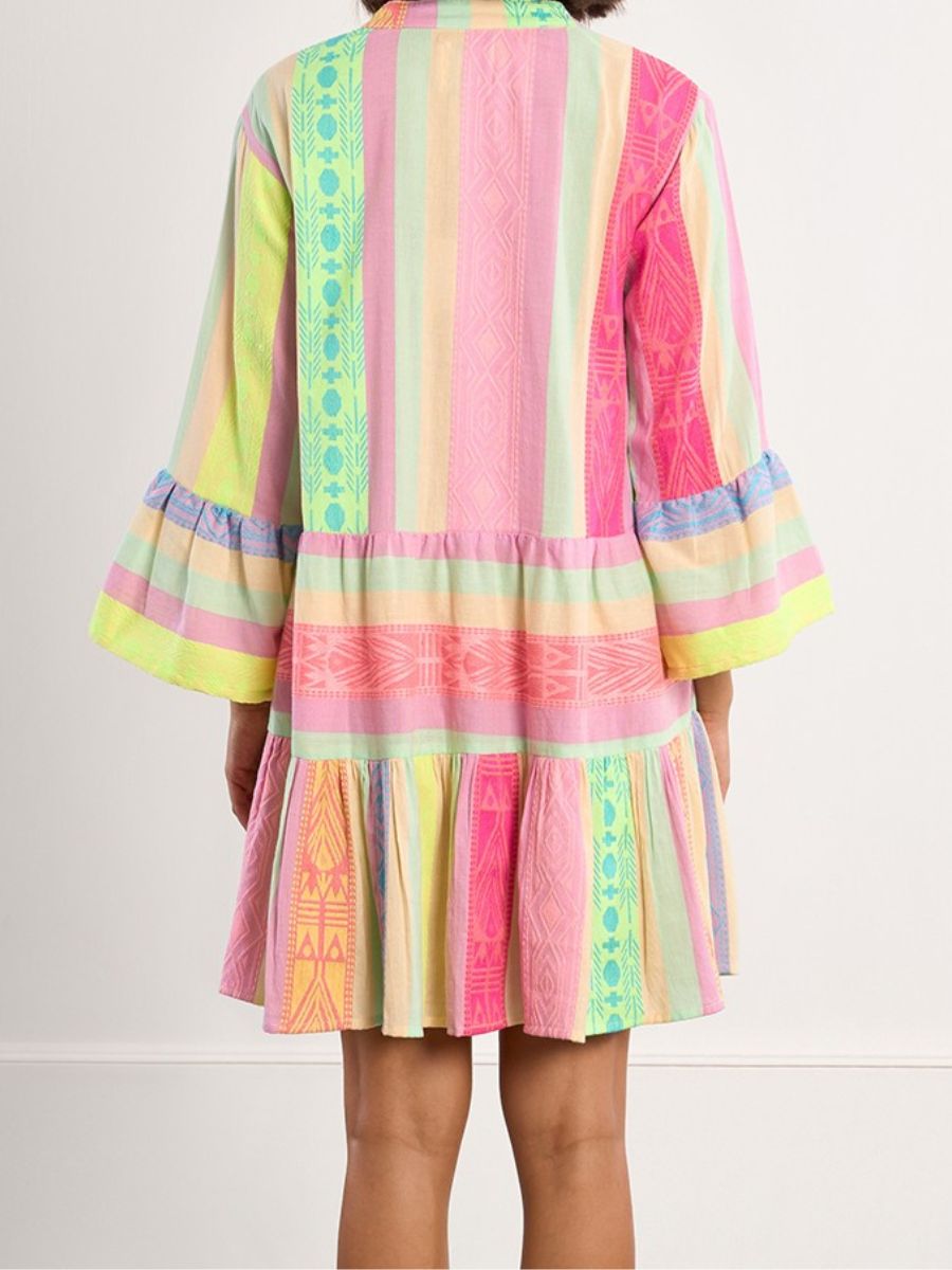 Cette robe courte multicolore en coton léger de Lili Sidonio offre un toucher doux et agréable sur la peau, parfait pour les journées ensoleillées. Sa coupe fluide et ses manches longues garantissent le confort tout en restant féminine. Le mélange harmonieux de motifs et de couleurs valorise la tenue. Idéale pour les sorties en été, les brunchs entre amis ou les balades en ville, elle combine l’élégance et le style décontracté. Laissez-vous séduire par cette pièce versatile qui illumine votre garde-robe.